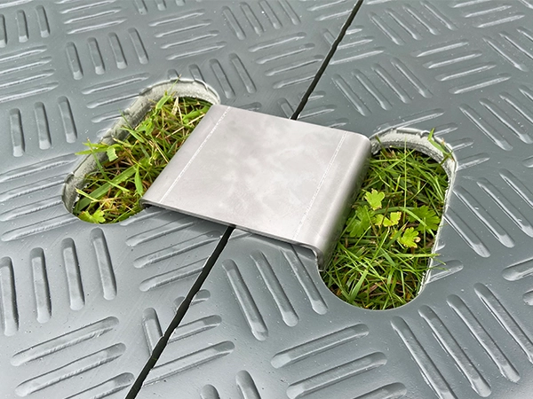 Håndtakskoblinger laget av Varmgalvanisert Magnelis plate gir en praktisk løsning for å koble sammen Tempotrax grunnbeskyttelsesmatter på jevne overflater. Disse koblingene gjør det enkelt og effektivt å koble mattene sammen.
